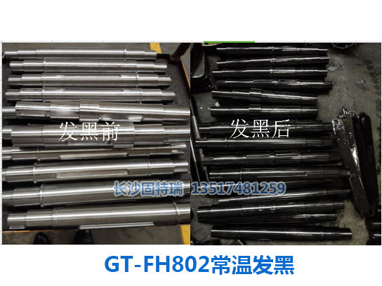 3、槽液調整:發黑液在使用中, 應注意檢查PH值,當PH值超過2.5時應加以調整,方法為先將溶液過濾去沉淀,再加GT-FH802常溫鋼鐵發黑劑濃縮液,使PH值恢復到2~2.5,即可繼續使用,調整2~3次后要更換發黑液。當槽液PH值超過3以上很難調整,可適當延長發黑時間一直到不能用為止,一般最長為6~7分鐘,才能成膜,使用一段時間后再更換槽液。