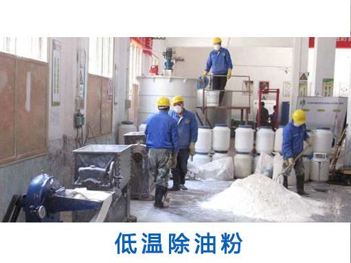 將水加入處理槽內六成;除油粉30-50公斤,邊攪拌邊溶解至溶解完全;加余量的水補足1000公斤。